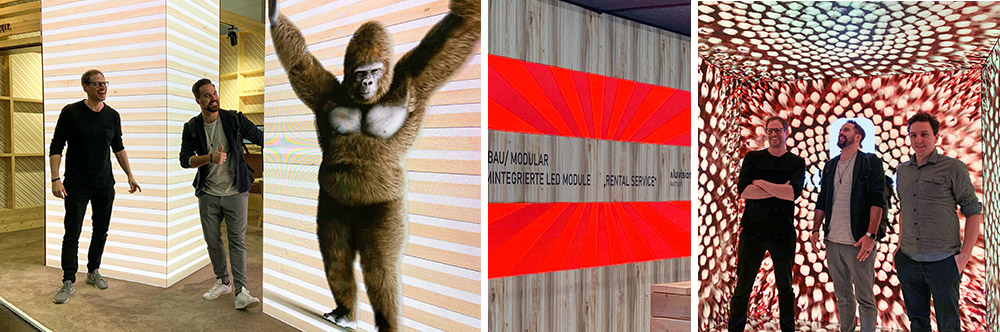 Der auffälligste Messetrend auf der diesjährigen EuroShop war die Kombination von Bewegtbild mit natürlichen Materialien. Wo man hinsah: Videowalls und Screens, die um die Aufmerksamkeit der Besucher warben. Das Besondere: Durch die Kombination mit Holz, Pappe oder Stoff wirkten die Messestände emotional und nahbarer. Normalerweise erscheinen Messestände mit viel Technik und Lightboxes schnell recht kühl. Für die reine Produktpräsentation sicherlich eine gute Option, aber gerade bei dem immer größer werden Trend hin zum Kommunikationserlebnis hat man bei sehr technischen Messeständen das Gefühl, dass die Emotion fehlt. Der Materialmix mit natürlichen Oberflächen (Holz, Papier, ggfs. Beton) wirkt dem entgegen und schafft eine emotionale Bildsprache, die dank der Screen-Technologie trotzdem sehr modern und zukunftsorientiert wirkt. Besonders hervorheben möchte ich hier den Messestand der Agentur Fricke. Karsten Fricke hat zusammen mit seinem Team mit seinem Messestand diesen Mix perfekt inszeniert – und der tanzende Gorilla war ein echter Hingucker.